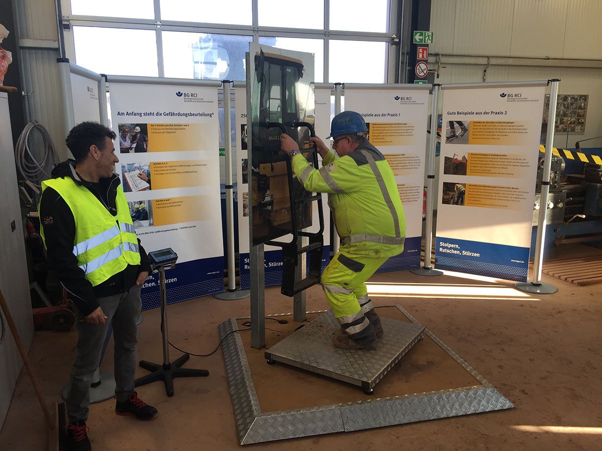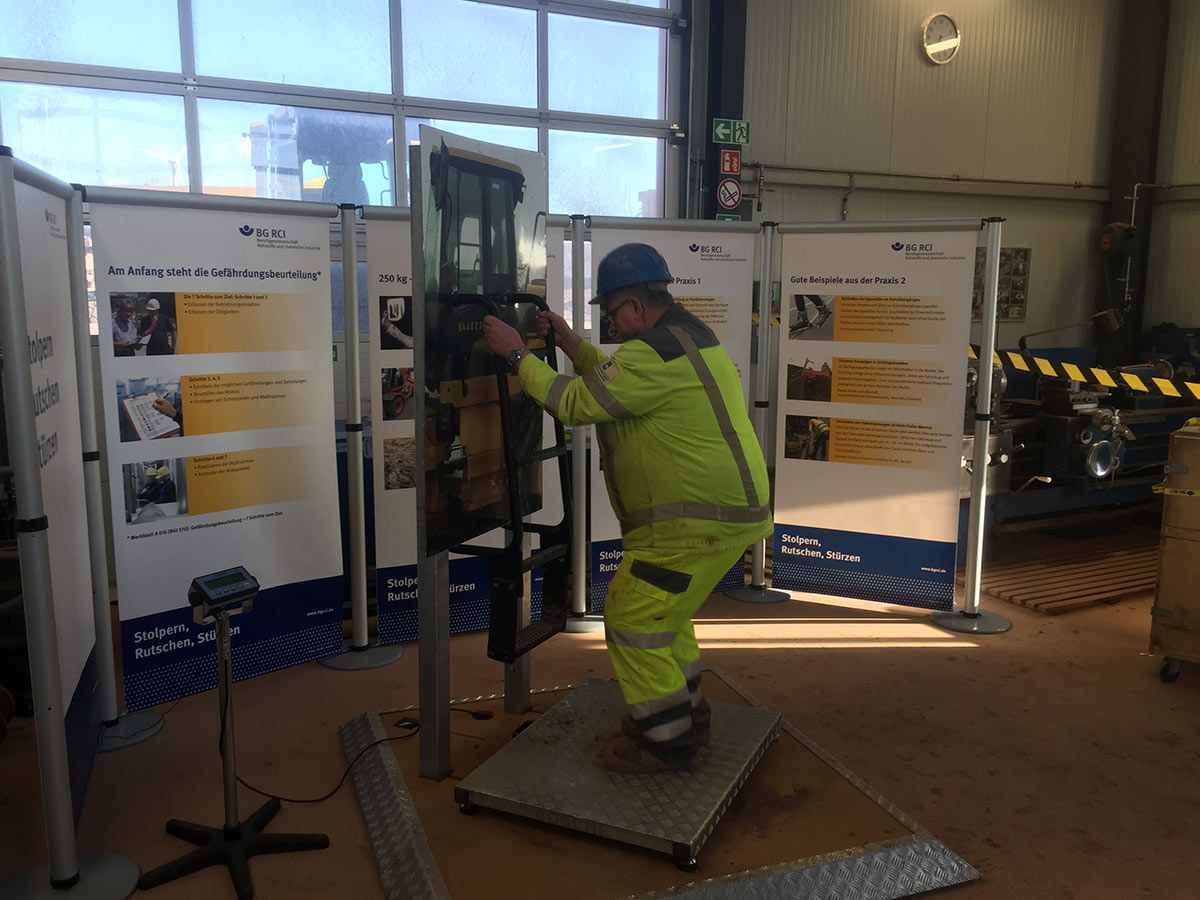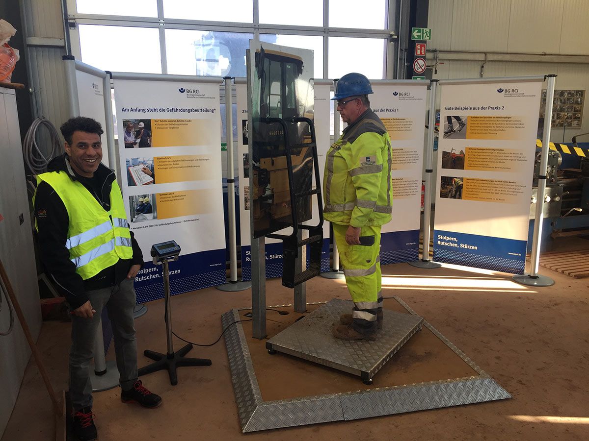Anknüpfend an die beiden letzten Gesundheitstage fand dieses Jahr ein Arbeitsschutztag mit Unterstützung verschiedenster BGRCI Arbeitsschutzmedien und Mitarbeiter statt. Das altbewährte Förderbandmodell, sowie insbesondere die Abstiegswaage, die uns die auftretenden Kräfte beim Absteigen von Baumaschinen sehr beeindruckend verdeutlicht, fanden großen Zuspruch. Ein besonderer Dank gilt der BGRCI, die uns hier tatkräftig zur Seite stand!