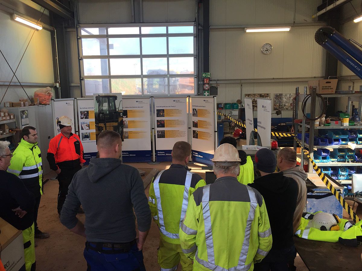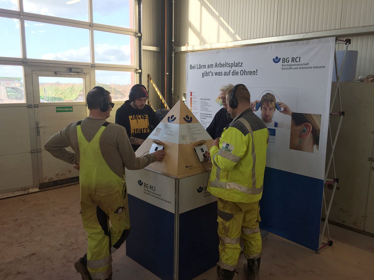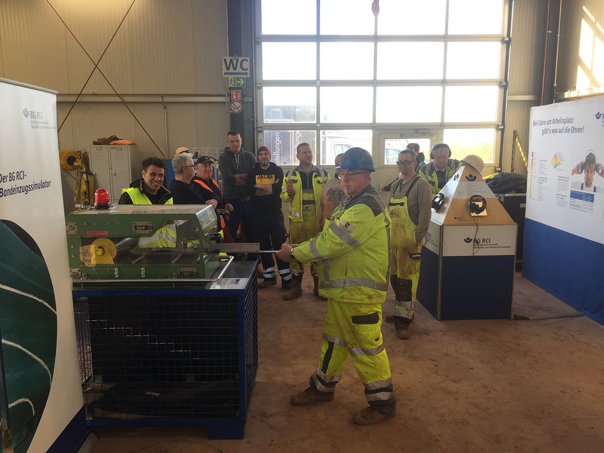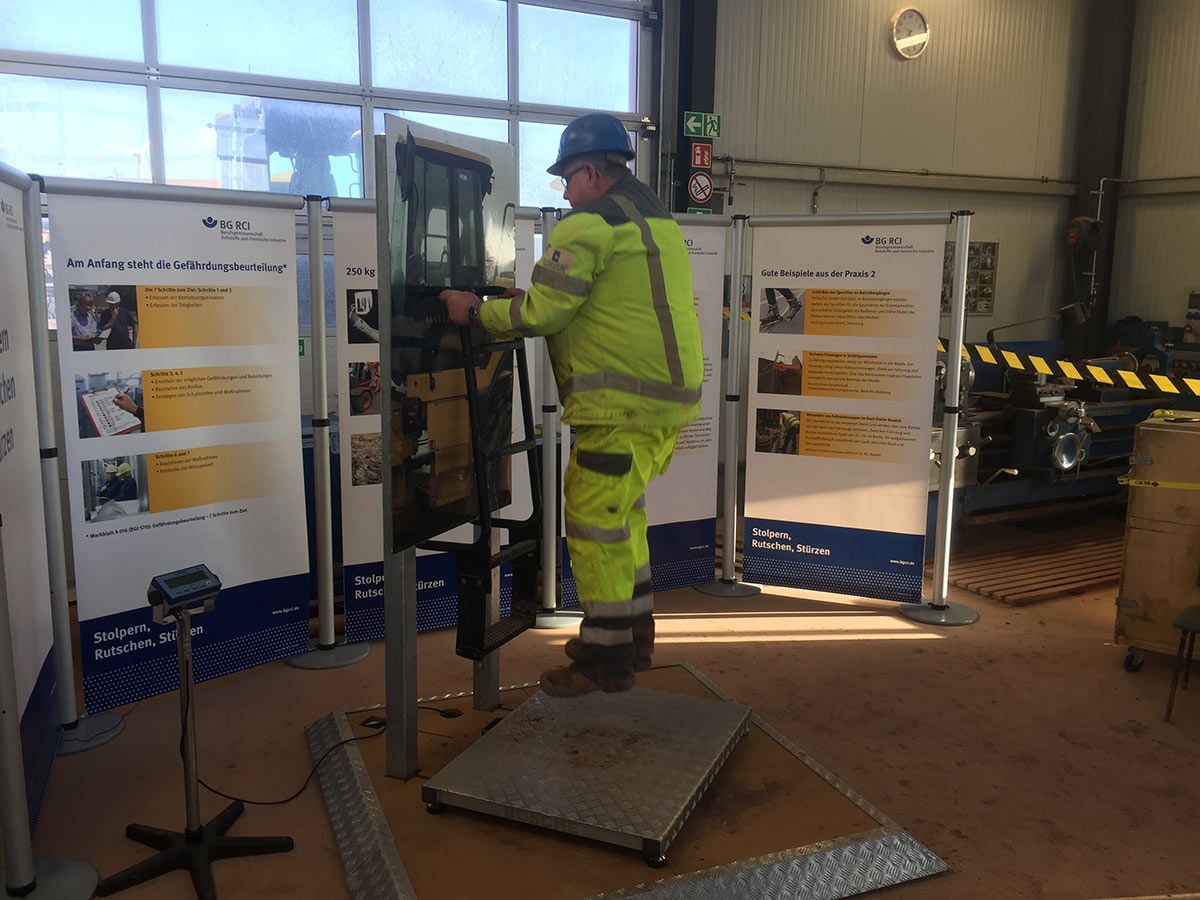 Anknüpfend an die beiden letzten Gesundheitstage fand dieses Jahr ein Arbeitsschutztag mit Unterstützung verschiedenster BGRCI Arbeitsschutzmedien und Mitarbeiter statt. Das altbewährte Förderbandmodell, sowie insbesondere die Abstiegswaage, die uns die auftretenden Kräfte beim Absteigen von Baumaschinen sehr beeindruckend verdeutlicht, fanden großen Zuspruch. Ein besonderer Dank gilt der BGRCI, die uns hier tatkräftig zur Seite stand!