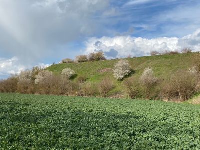 Die Pflanzung der Hecke am Wallfuß wurde bereits 2001-2002 durchgeführt. In den Folgejahren wurden an Hang und Wallkrone immer wieder Bäume und Sträucher ergänzt, so dass sich der Wall mittlerweile zu einem harmonischen Landschaftselement und gleichzeitig exponiertem Lebensraum für eine artenreiche Tier- und Pfanzenwelt entwickelt hat.